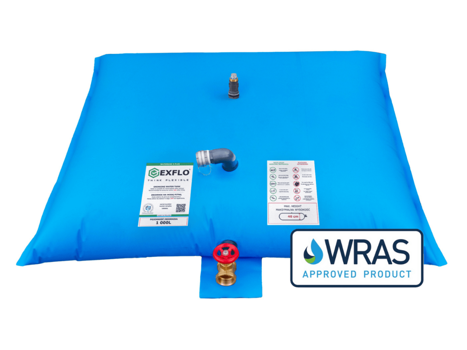 - Waterbase D Plus is made of thermoplastic polyurethane (TPU)-coated fabric with extremely low particle migration. The tank is certified by the Polish National Institute of Public Health (PZH), ensuring it meets national standards for materials intended for contact with potable water. It also complies with BS 6920 and holds the WRAS certificate – a European quality mark confirming the hygienic safety and neutrality of the material in contact with drinking water.